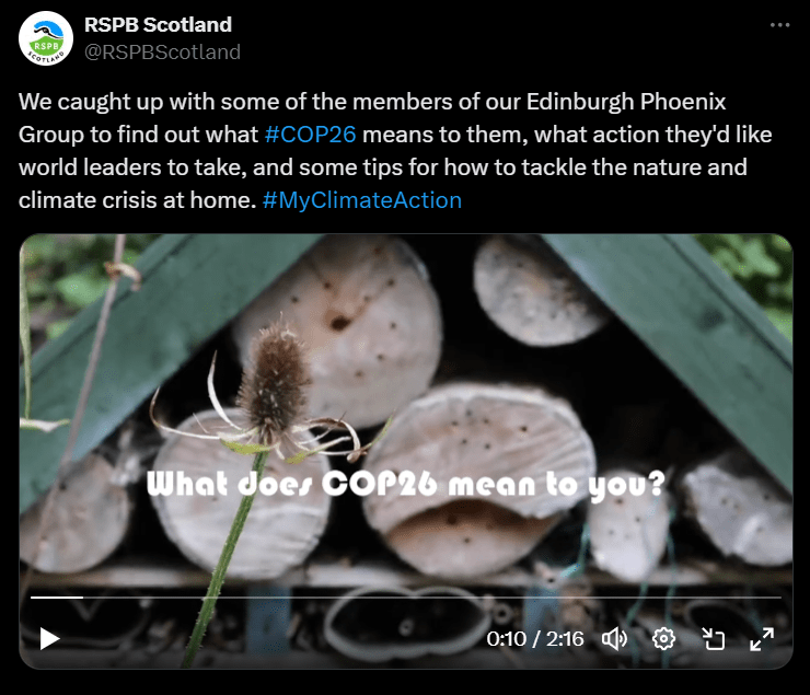 During my time interning with the RSPB, I was asked to attend COP26 as a youth delegate. In this space, I attended plenary sessions, spoke to politicians and NGOs and created media content for the RSPB. As part of this work, I also worked on several short films which were shown at a film festival at the conference.